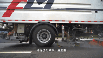该车采用“中置两盘扫+中置V型喷水架+中置双吸口宽吸嘴结构+后置深度保洁宽吸嘴+左、右高压侧喷杆”, 左右喷杆同时摆出时,最大洗扫宽度可达4.1m。
