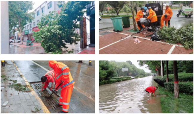 因暴雨大风侵袭,出现老化电路漏电、雨水井盖遗落、排水口排水吸力加大、建筑物墙体松动,道路积水路段断交等情况,大幅增加了安全隐患和工作难度,但福龙马人不畏风雨,迅速组织5名环卫精英成立救援组,积极配合涿州市综合行政执法局开展抢险救援任务。